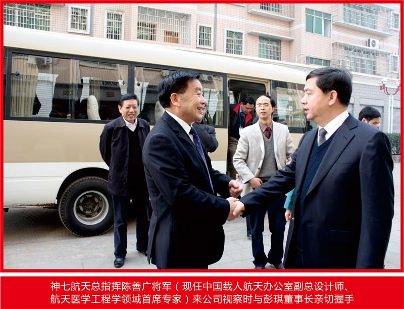 神七航天总指挥陈善广将军来公司视察时与彭琪董事长亲切握手