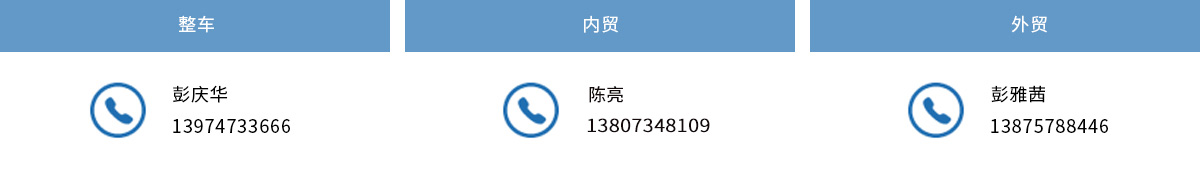 整车 联系人:彭先生 电话:13974733666 内贸 联系人:陈先生 电话:13807348109 外贸 联系人:彭女士 电话:13875788446
